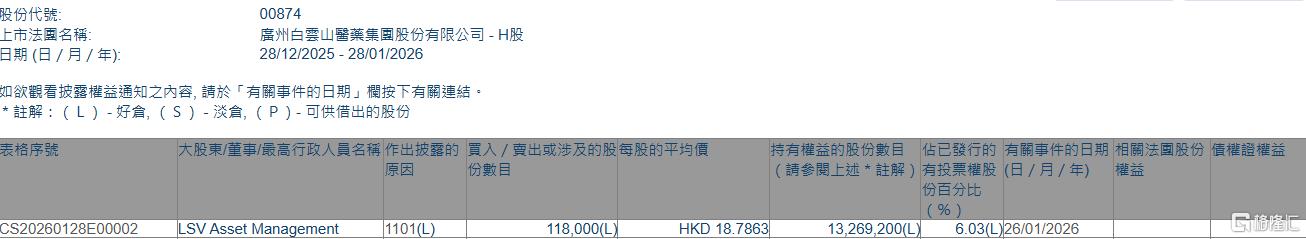 | 股份代號: | 00874 | | --- | --- | | 上市法國名稱: | 廣州白雲山醫藥集團股份有限公司 - H股 | | 日期 (日 / 月 / 年): | 28/12/2025 - 28/01/2026 | 格隆汇1月28日丨根据联交所最新权益披露资料显示,2026年1月26日,白云山(00874.HK)获LSV Asset Management在场内以每股均价18.7863港元增持11.8万 股,涉资约221.68万港元。 增持后,LSV Asset Management最新持股数目为1326.92万股,持股比例由5.98%上升至6.03%。 | 震格序號 | 大股東/董事/最高行政人員名稱作出披露的 買入 / 賣出或涉及的股每股的平均價 | | | | 持有權益的股份數目 佔已發行的 有關事件的日 | | | --- | --- | --- | --- | --- | --- | --- | | | | | 份數 言 | | (請參閱上述*註解)有投票權股(日/月/年) | | | | | | | | 份自分比 | | | Controller Production Company of ...
