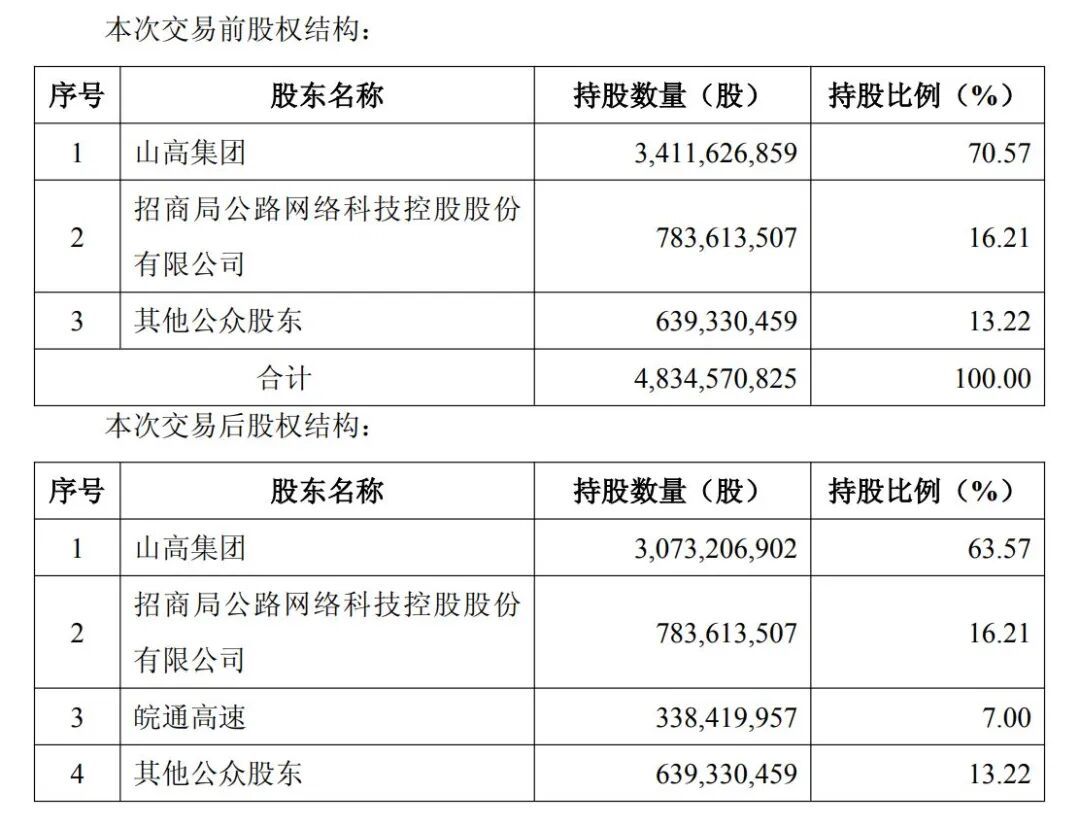 10月21日晚间,皖通高速(SH600012)发布公告称,拟以总价约30.19亿元,通过非公开协议转让方式,受让山东高速集团有限公司(以下简称山高集 团)持有的山东高速(SH600350)7%的股份。本次交易涉及股份数量达3.38亿股,转让价格确定为每股8.92元。 本次交易前,山高集团持有山东高速34.12亿股,占总股本的70.57%,为控股股东。皖通高速未持有山东高速股份。 | 序号 | 股东名称 | 持股数量(股) | 持股比例(%) | | --- | --- | --- | --- | | 1 | 山高集团 | 3,411,626,859 | 70.57 | | 2 | 招商局公路网络科技控股股份 有限公司 | 783,613,507 | 16.21 | | 3 | 其他公众股东 | 639,330,459 | 13.22 | | | 合计 | 4,834,570,825 | 100.00 | 交易完成后,皖通高速将持有山东高速7%的股份,并有权提名或推荐1名董事。皖通高速表示,此举是基于对山东高速发展前景的信心和价值的认可,旨 在通过扩大有效投资推动公司聚焦主业、做强做优。山高集团方面则表示,交易 ...