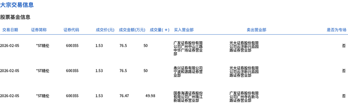 | 交易日期 | 证券简称 | 证券代码 | | | 成交价(元) 成交金额(万元) 成交量(*) 买入营业部 | | 卖出营业部 | 是否为专场 | | --- | --- | --- | --- | --- | --- | --- | --- | --- | | 2026-02-05 | "ST精伦 | 600355 | 1.53 | 76.5 | 50 | 公司 前中 | 公司 11 2017 | 140 | | 2026-02-05 | *ST精伦 | 600355 | 1.53 | 76.5 | 50 | 品菜加盟酒店美品 | 公司 - 1 | KI | | 2026-02-05 | *ST精伦 | 600355 | 1.53 | 76.47 | 49.98 | 有周公司广 | 公開日期參考資料 | Ka | 2月5日,*ST精伦大宗交易成交149.98万股,成交额229.47万元,占当日总成交额的63.82%,成交价1.53 元,较市场收盘价1.53元持平。 ...