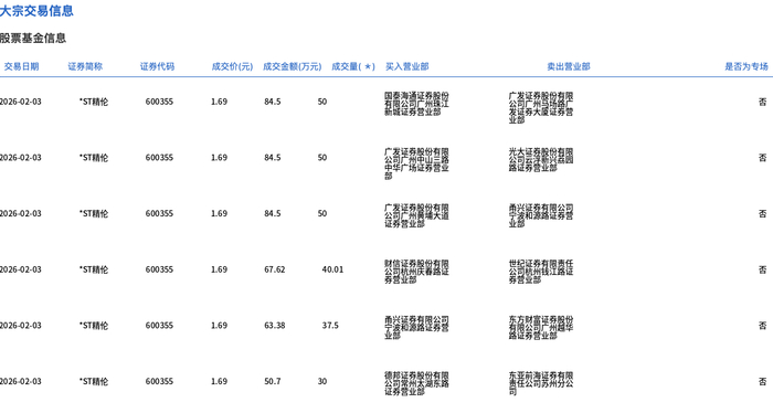 | 交易日期 | 证券简称 | 证券代码 | 成交价(元) | | | 成交会颜(万元) 成交量(*) 买入营业部 | 卖出营业部 | 是否为专场 | | --- | --- | --- | --- | --- | --- | --- | --- | --- | | 2026-02-03 | *ST精修 | 600355 | 1.69 | 84.5 | 50 | 有限公司广州县工 | | 포 | | 2026-02-03 | *ST精伦 | 600355 | 1.69 | 84.5 | 50 | 公司广州中山三 | | 종 | | 2026-02-03 | *ST精伦 | 600355 | 1.69 | 84.5 | 50 | 公司产品 | 學家和資品學學 | 같 | | 2026-02-03 | "ST剧伦 | 600355 | 1.69 | 67.62 | 40.01 | 公司机构使 基层设 | 器制品 保存 | 같 | | 2026-02-03 | "STINGS. | 600355 | 1.69 | 63.38 | 37.5 | 半分量多数学家 | | る | | 2026-02-03 | *ST精伦 ...