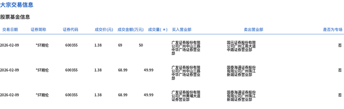 | 交易日期 | 证券简称 | 证券代码 | | | 成交价(元) 成交金额(万元) 成交量(*) 买入营业部 | 类出营业部 | 是否为专场 | | --- | --- | --- | --- | --- | --- | --- | --- | | 2026-02-09 | "ST精伦 | 600355 | 138 | 69 | 50 | 都 大 | 190 | | 2026-02-09 | *ST精伦 | 600355 | 1.38 | 68.99 | 49.99 | | KI | | 2026-02-09 | *ST精伦 | 600355 | 1.38 | 68.99 | 49.99 | | Ka | 2月9日,*ST精伦大宗交易成交149.98万股,成交额206.98万元,占当日总成交额的34.83%,成交价1.38 元,较市场收盘价1.38元持平。 ...