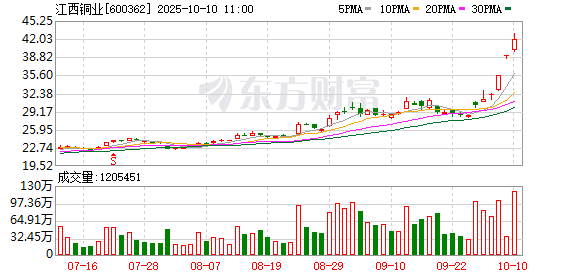 龙虎榜数据显示,该股因连续三个交易日内,涨幅偏离值累计达20%上榜龙虎榜1次,买卖居前营业部 中,机构净买入3.72亿元,沪股通累计净买入1315.60万元,营业部席位合计净买入8004.58万元。 据天眼查APP显示,江西铜业股份有限公司成立于1997年01月24日,注册资本346272.9405万人民币。 (数据宝) 江西铜业盘中涨停,已连收3个涨停板,截至9:51,该股报42.94元,换手率3.85%,成交量7993.57万 股,成交金额33.23亿元,涨停板封单金额为1842.56万元。连续涨停期间,该股累计上涨33.11%,累计 换手率为10.56%。最新A股总市值达891.11亿元。 证券时报·数据宝统计,两融数据来看,该股最新(10月9日)两融余额为17.46亿元,其中,融资余额 17.35亿元,较前一个交易日增加5687.15万元,环比增长3.39%,近3日累计增加8976.12万元,环比增长 5.45%。 近日该股表现 | 日期 | 当日涨跌幅(%) | 换手率(%) | 主力资金净流入(万元) | | --- | --- | --- | --- | | 2025.10.09 | 10.00 ...