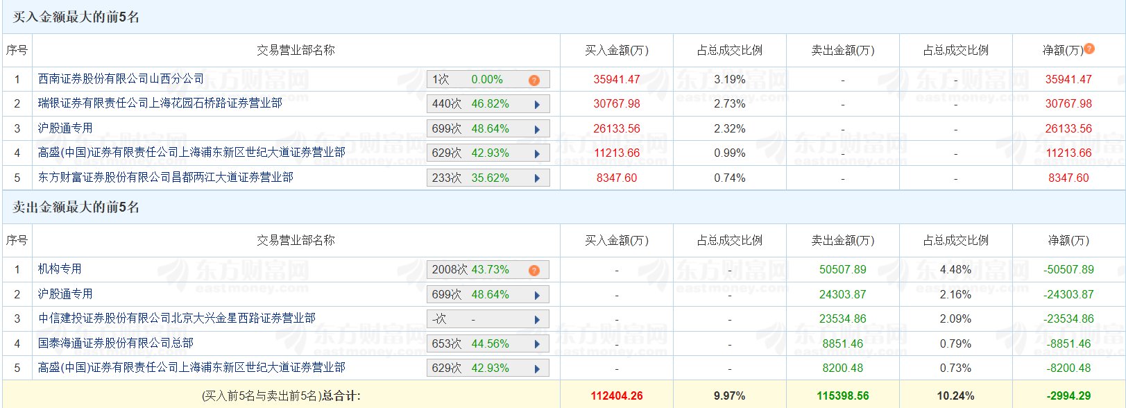 | 序号 | 交易营业部名称 | | | 买入金额(万) | 占总成交比例 | | --- | --- | --- | --- | --- | --- | | 1 | 西南证券股份有限公司山西分公司 | 1次 0.00% | 2 | 35941.47 | 3.19% | | 2 | 瑞银证券有限责任公司上海花园石桥路证券营业部 | 440次 46.82% | | 30767.98 | 2.73% | | 3 | 护股通专用 | 699次 48.64% | | 26133.56 | 2.32% | | 4 | 高盛(中国)证券有限责任公司上海浦东新区世纪大道证券营业部 | 629次 42.93% | | 11213.66 | 0.99% | | 5 | 东方财富证券股份有限公司昌都两江大道证券营业部 | 233次 35.62% | | 8347.60 | 0.74% | 江西铜业(600362.SH)今日涨9.56%,换手率8.15%,成交额112.74亿元。龙虎榜数据显示,一家机构位列卖一席位,卖出5.05亿元;游资"量化基金"位列买 二、买四、卖四及卖五席位,净买入2.49亿元。(格隆汇) | 买入金额最大 ...
