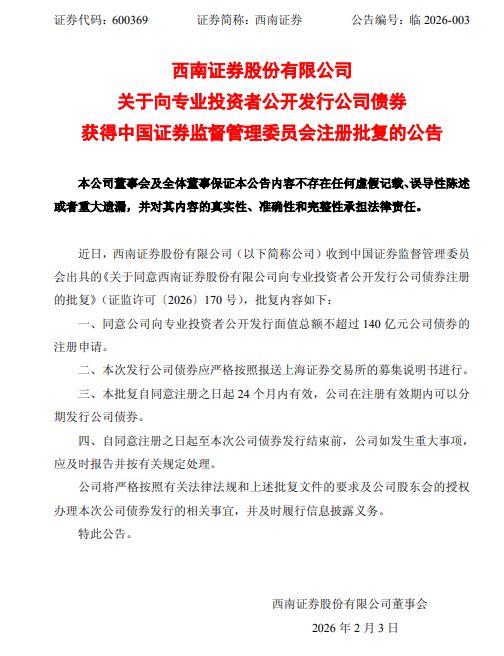 西南证券(600369)(600369)发布公告称,已收到中国证监会注册批复,公司获准向专业投资者公开 发行不超过140亿元公司债券,批文有效期24个月,可分期发行。 2025年1至9月,西南证券自营板块实现业务收入(投资收益+公允价值变动收益-对联营企业和合营企业 的投资收益)10.7亿元,同比增长超37%。 未来,西南证券将坚守金融本源,持续扎根成渝地区双城经济圈建设,深化"耐心资本+全周期陪伴"服 务模式,在服务实体经济、培育新质生产力中彰显券商担当,奋力谱写高质量发展新蓝图。(全景网 龚璨) 图/西南证券获准发行公司债的公告 必须看到,此次公司债获批体现了监管层对公司综合实力与合规风控能力的高度认可,也将为其深化核 心优势、赋能实体经济注入强劲动力。 作为扎根西南的头部券商,西南证券核心竞争力持续凸显。公司坚持深耕区域市场,聚焦金融"五篇大 文章",科技金融、绿色金融等领域成果丰硕,稳健发展根基日益夯实。 值得指出的是,2025年前三季度,公司自营业务把握市场节奏,财富管理与资产管理业务稳扎稳打,投 资银行业务战略聚焦,综合推进实现公司经营业绩的有力增长。 ...