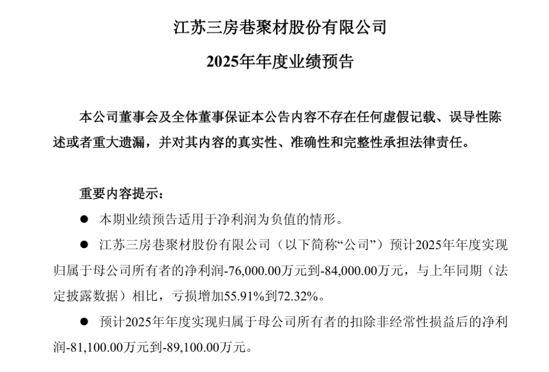 1月19日晚间,三房巷(600370)公告称,公司预计2025年年度实现归属于母公司所有者的净利润-8.4亿元至-7.6亿元,亏损同比增加55.91%到72.32%;预 计实现归属于母公司所有者的扣除非经常性损益后的净利润-8.91亿元至-8.11亿元。 公开资料显示,三房巷成立于1994年,2003年在上交所上市,主营业务以瓶级聚酯切片、PTA的生产与销售为核心,以PBT工程塑料、热电的生产与销售 等业务为补充。 三房巷解释称,2025年,受行业新增产能持续释放影响,市场供需失衡,行业竞争加剧,公司主要产品销售价格下降,产能利用率下降,加工费持续低位 运行,毛利下降;同时,受汇率波动影响,公司汇兑损失增加,公司整体亏损较上年同期扩大。 值得一提的是,三房巷在2023年、2024年已连亏两年,归母净利润分别为-2.75亿元、-4.87亿元。结合2025年业绩预告计算可知,三房巷3年累计亏损额约 15.22亿元至16.02亿元。 此外,数据显示,三房巷2021年至2024年资产负债率连年走高。截至2025年9月30日,该公司资产负债率达73.14%,高于行业均值39.31%;应收账款为 38.16亿元,同比减少 ...