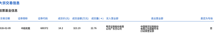 2月9日,中航机载大宗交易成交22.76万股,成交额323.19万元,占当日总成交额的0.4%,成交价14.2 元,较市场收盘价15.49元折价8.33%。 | 股票委员提省 | | | | | | | | | | --- | --- | --- | --- | --- | --- | --- | --- | --- | | 交易日期 | 证券简称 | 证券代码 | 成交价(元) 成交金额(万元) 成交量( *) 买入营业部 | | | | 卖出营业部 | 是否为 | | 026-02-09 | 中航机载 | 600372 | 14.2 製蛋評素劈盤有限 | 323.19 | 22.76 | 我開發了睡覺學常 | | | ...