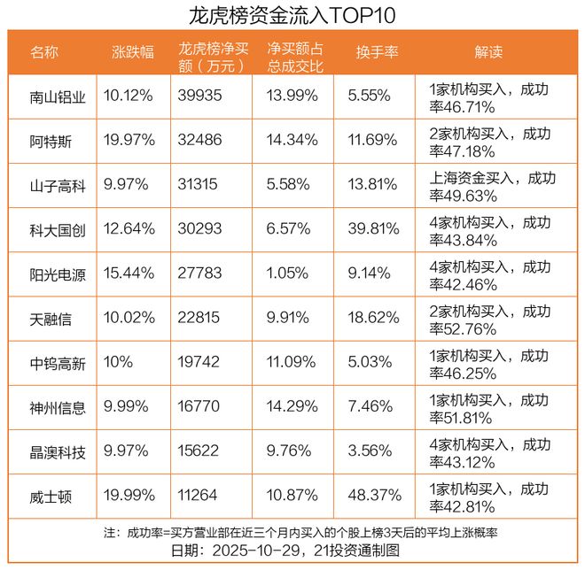 10月29日,上证指数上涨0.7%,深证成指上涨1.95%,创业板指上涨2.93%。盘后龙虎榜数据显示,共 有52只个股因当日异动登上龙虎榜,资金净流入最多的是南山铝业(600219.SH),达3.99亿元。 据21投资通智能监测,35只个股龙虎榜出现了机构的身影,北向资金参与龙虎榜中的个股共涉及0只。 52只上榜的龙虎榜个股中,27只个股被净买入,25只个股被净卖出。其中,资金净买入最多的是南山铝 业,达3.99亿元,占总成交金额的13.99%。南山铝业当日收盘上涨10.12%,换手率为5.55%。 | 名称 | 涨跌幅 | 戊席榜净买 | 净买额占 | | | | --- | --- | --- | --- | --- | --- | | | | 额(万元 | 总成交比 | | | | 南山铝业 | 10.12% | 39935 | 13.99% | 5.55% | 1家机构买入,成功 | | | | | | | 率46.71% | | 阿特斯 | 19.97% | 32486 | 14.34% | 11.69% | 2家机构买入,成功 | | | | | | | 率47.18% | | 山子高科 | 9 ...