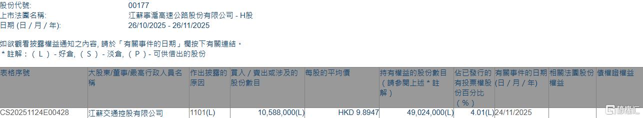 江苏交通控股有限公司增持江苏宁沪高速公路1058.8万股 每股作价约9.89港元