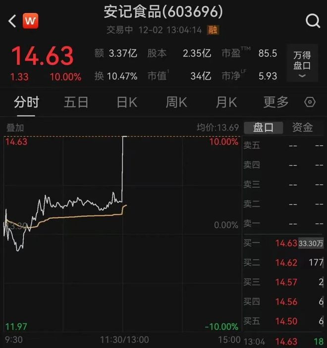 12月2日午后,食品板块异动,安记食品、惠发食品双双直线拉升涨停。 | < W | | | 惠发食品(603536) | | | | | | | --- | --- | --- | --- | --- | --- | --- | --- | --- | | | | | 交易中 12-02 13:04:28 | | | | | | | 14.87 | | 额 1.59亿 | 股本 2.42亿 | | 市盈利 | -131 | 万得 | | | 1.35 | 9.99% | 换 4.84% | 市值 | 36亿 | 黄色 | 8.95 | 盘口 | | | 分时 | 九日 | 日K | 周K | | 目K | 申名 | | | | 鹽加 14.87 | | | | | 均价:13.67 9.99% | 器■ | | | | 13.52 | | | | | 35 0.00% | | | | | | | | | | | | 14.87 13.90万 | | | | | | | | | 14.86 | | 11 | | | | | | | | 14.83 | | | | | | | | | | 14.82 | | 1 ...