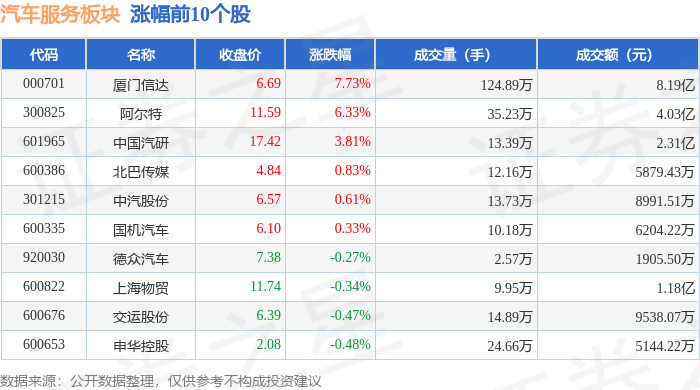 | 代码 | 名称 | 收盘价 | 涨跌幅 | 成交量(手) | 成交额(元) | | | --- | --- | --- | --- | --- | --- | --- | | 000701 | 厦门信达 | 6.69 | 7.73% | 124.89万 | | 8.19 Z | | 300825 | 阿尔特 | 11.59 | 6.33% | 35.23万 | | 4.03亿 | | 601965 | 中国汽研 | 17.42 | 3.81% | 13.39万 | | 2.31亿 | | 600386 | 北巴传媒 | 4.84 | 0.83% | 12.16万 | | 5879.43万 | | 301215 | 中汽股份 | 6.57 | 0.61% | 13.73万 | | 8991.51万 | | 600335 | 国机汽车 | 6.10 | 0.33% | 10.18万 | | 6204.22万 | | 920030 | 德众汽车 | 7.38 | -0.27% | 2.57万 | | 1905.50万 | | 600822 | 上海物贸 | 11.74 | -0.34% | 9.95万 | | ...