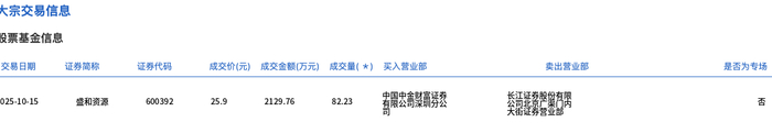 Group 1 - The core transaction involved Shenghe Resources, with a total of 822,300 shares traded on October 15, amounting to 21.2976 million yuan, which represents 0.25% of the total trading volume for that day [1] - The transaction price was 25.9 yuan per share, reflecting a discount of 1.37% compared to the market closing price of 26.26 yuan [1]