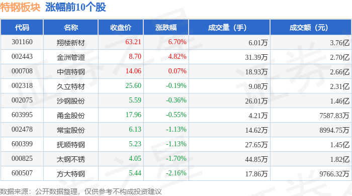 证券之星消息,10月24日特钢板块较上一交易日下跌0.46%,西宁特钢领跌。当日上证指数报收于 3950.31,上涨0.71%。深证成指报收于13289.18,上涨2.02%。特钢板块个股涨跌见下表: | 代码 | 名称 | 收盘价 | 涨跌幅 | 成交量(手) | 成交额(元) | | | --- | --- | --- | --- | --- | --- | --- | | 301160 | 翔楼新材 | 63.21 | 6.70% | 6.01万 | | 3.76亿 | | 002443 | 金洲管道 | 8.70 | 4.82% | 31.39万 | | 2.70亿 | | 000708 | 中信特钢 | 14.06 | 0.07% | 18.93万 | | 2.66亿 | | 002318 | 久立特材 | 25.60 | -0.19% | 1 9.08万 | | 2.31亿 | | 002075 | 沙钢股份 | 5.59 | -0.36% | 26.01万 | | 1.46 Z | | 603995 | 更美股份 | 17.96 | -0.55% | 4.21万 | 7587.83万 | | | ...