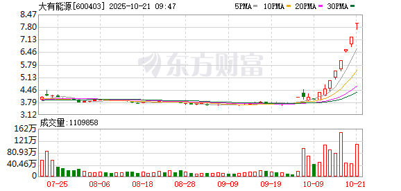 | 日期 | 当日涨跌幅(%) | 换手率(%) | 主力资金净流入(万元) | | --- | --- | --- | --- | | 2025.10.20 | 10.00 | 1.93 | -2961.57 | | 2025.10.17 | 10.00 | 2.01 | 11189.27 | | 2025.10.16 | 10.09 | 6.29 | -5938.85 | | 2025.10.15 | 10.10 | 3.32 | 4918.06 | | 2025.10.14 | 10.00 | 3.85 | 6595.92 | | 2025.10.13 | 4.41 | 4.46 | -536.81 | | 2025.10.10 | 9.95 | 2.11 | 9815.32 | | 2025.10.09 | -3.45 | 1.83 | -318.05 | | 2025.09.30 | 0.00 | 2.98 | 162.83 | | 2025.09.29 | 0.00 | 4.02 | -8795.45 | 大有能源再度涨停,8个交易日内录得7个涨停,累计涨幅为103.83%,累计换手率为24.45 ...