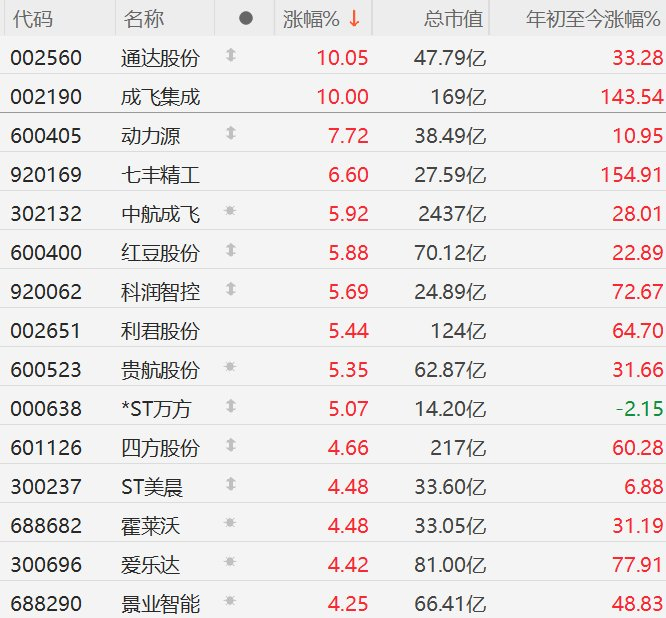 Core Viewpoint - The A-share market saw a strong performance in military stocks, particularly with companies like Tongda Co. and Chengfei Integration hitting the daily limit, following Indonesia's confirmation of plans to purchase Chinese J-10 fighter jets [1] Group 1: Stock Performance - Tongda Co. (002560) increased by 10.05%, with a total market value of 4.779 billion [2] - Chengfei Integration (002190) rose by 10.00%, with a market capitalization of 16.9 billion [2] - Power Source (600405) gained 7.72%, with a market value of 3.849 billion [2] - Qifeng Precision (920169) saw a rise of 6.60%, with a market cap of 2.759 billion [2] - AVIC Chengfei (302132) increased by 5.92%, with a market value of 243.7 billion [2] - Hongdou Co. (600400) rose by 5.88%, with a market capitalization of 7.012 billion [2] - Kairun Intelligent Control (920062) increased by 5.69%, with a market value of 2.489 billion [2] - Lijun Co. (002651) rose by 5.44%, with a market capitalization of 12.4 billion [2] - Guihang Co. (600523) increased by 5.35%, with a market value of 6.287 billion [2] Group 2: Year-to-Date Performance - Chengfei Integration (002190) has seen a year-to-date increase of 143.54% [2] - Qifeng Precision (920169) has a year-to-date increase of 154.91% [2] - Kairun Intelligent Control (920062) has increased by 72.67% year-to-date [2] - Lijun Co. (002651) has a year-to-date increase of 64.70% [2] - Guihang Co. (600523) has increased by 31.66% year-to-date [2]