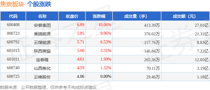 Core Viewpoint - The coking coal sector experienced a significant increase of 5.66% on November 17, with Antai Group leading the gains, while the overall stock indices showed a decline [1] Group 1: Market Performance - The Shanghai Composite Index closed at 3972.03, down 0.46% - The Shenzhen Component Index closed at 13202.0, down 0.11% [1] Group 2: Coking Coal Stocks Performance - Antai Group (600408) closed at 6.89, up 10.06% with a trading volume of 4.13 million shares and a turnover of 2.701 billion yuan - Meijin Energy (000723) closed at 5.85, up 9.96% with a trading volume of 3.76 million shares and a turnover of 2.131 billion yuan - Yunmei Energy (600792) closed at 5.71, up 6.53% with a trading volume of 1.58 million shares and a turnover of 883 million yuan - Shaanxi Black Cat (601015) closed at 5.00, up 3.31% with a trading volume of 1.47 million shares and a turnover of 722 million yuan - Baotailong (601011) closed at 4.61, up 1.99% with a trading volume of 2.65 million shares and a turnover of 1.205 billion yuan - Shanxi Coking Coal (600740) closed at 4.59, up 1.32% with a trading volume of 701,100 shares and a turnover of 319 million yuan - Yunwei Co. (600725) closed at 4.06, unchanged with a trading volume of 294,600 shares and a turnover of 118 million yuan [1] Group 3: Capital Flow Analysis - The coking coal sector saw a net inflow of 142 million yuan from main funds, while retail funds experienced a net outflow of 20.34 million yuan - The main funds' net inflow and outflow for key stocks are as follows: - Meijin Energy: 436 million yuan net inflow, 20.45% of total - Baotailong: 47.23 million yuan net inflow, 3.92% of total - Shanxi Coking Coal: 38.06 million yuan net inflow, 11.92% of total - Yunmei Energy: 31.12 million yuan net inflow, 3.53% of total - Shaanxi Black Cat: 27.09 million yuan net inflow, 3.75% of total - Yunwei Co.: 17.55 million yuan net outflow, -14.83% of total - Antai Group: 42 million yuan net outflow, -15.54% of total [2]