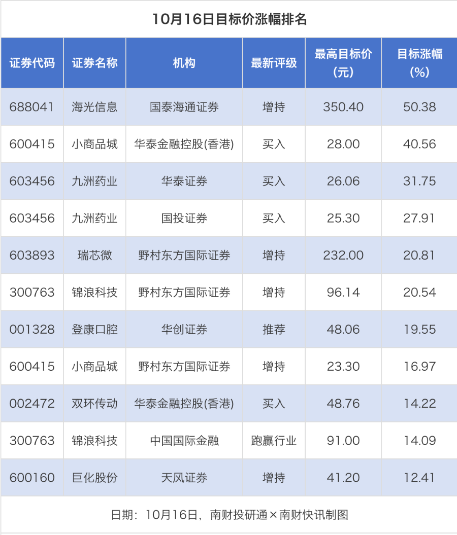 Group 1 - The article highlights the stock price target increases for various companies as of October 16, with notable recommendations from different securities firms [1][2] - Haiguang Information received the highest target price increase of 50.38% with a target price of 350.40 yuan, while Xiaogongmiao City and Jiuzhou Pharmaceutical also received significant recommendations [1] - A total of 20 listed companies were recommended by securities firms on October 16, with Haiguang Information receiving 4 recommendations, Xiaogongmiao City 3, and Jiuzhou Pharmaceutical 2 [1] Group 2 - The article lists the number of securities firms recommending specific companies, with Haiguang Information leading with 4 firms, followed by Xiaogongmiao City with 3 and Jiuzhou Pharmaceutical with 2 [2] - Six companies received initial coverage on October 16, including Baiya Co. with a "Buy" rating from Jianghai Securities and Juhua Co. with an "Increase" rating from Tianfeng Securities [2][3] - The sectors represented among the newly covered companies include personal care products, chemical products, and IT services [3]