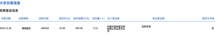 Group 1 - On November 20, Xiangdian Co., Ltd. executed a block trade of 718,000 shares, with a transaction amount of 9.9946 million yuan, accounting for 3.44% of the total trading volume for the day [1] - The transaction price was 13.92 yuan, which remained stable compared to the market closing price of 13.92 yuan [1]