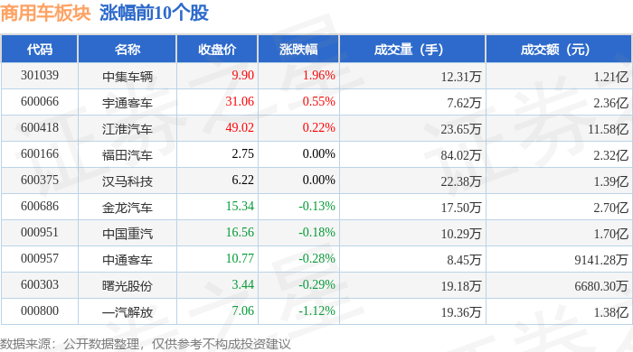 证券之星消息,11月26日商用车板块较上一交易日上涨0.01%,中集车辆领涨。当日上证指数报收于 3864.18,下跌0.15%。深证成指报收于12907.83,上涨1.02%。商用车板块个股涨跌见下表: | 代码 | 名称 | 收盘价 | 涨跌幅 | 成交量(手) | | 成交额(元) | | --- | --- | --- | --- | --- | --- | --- | | 301039 | 中集车辆 | 9.90 | 1.96% | | 12.31万 | 1.21亿 | | 600066 | 宇通客车 | 31.06 | 0.55% | | 7.62万 | 2.36亿 | | 600418 | 江淮汽车 | 49.02 | 0.22% | | 23.65万 | 11.58亿 | | 600166 | 福田汽车 | 2.75 | 0.00% | | 84.02万 | 2.32亿 | | 600375 | 汉马科技 | 6.22 | 0.00% | | 22.38万 | 1.39亿 | | 600686 | 金龙汽车 | 15.34 | -0.13% | | 17.50万 | 2.70亿 | | 000 ...