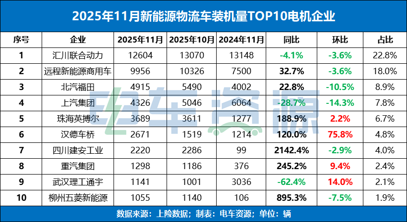 | | | | 2025年11月新能源物流车装机量TOP10电机企业 | | | | | | --- | --- | --- | --- | --- | --- | --- | --- | | 廖 | 企业 | 2025年11月 | 2025年10月 2024年11月 | | 同比 | 研 | 出 | | 1 | 汇川联合动力 | 12604 | 13070 | 13148 | -4.1% | -3.6% | 22.8% | | 2 | 远程新能源商用车 | વેત્ર રાજ્યના | 10326 | 7500 | 32.7% | -3.6% | 18.0% | | 3 | 北汽福田 | 4915 | 5490 | -4002 | 22.8% | -10.5% | 8.9% | | ব | 上汽集团 | 4326 | 5046 | 6064 | -28.7% | -14.3% | 7.8% | | 5 | 珠海英搏尔 | 3689 | 3611 | 1277 | 188.9% | 2.2% | 6.7% | | ୧ | 汉德车桥 | 2671 | 1519 | 12140 | 120.0% | 75.8% ...