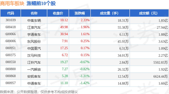 Core Insights - The commercial vehicle sector experienced a 0.72% increase on November 19, with CIMC Vehicles leading the gains [1] - The Shanghai Composite Index closed at 3946.74, up 0.18%, while the Shenzhen Component Index closed at 13080.09, unchanged [1] Commercial Vehicle Sector Performance - CIMC Vehicles (301039) closed at 10.12, up 2.33% with a trading volume of 183,100 shares and a turnover of 185 million yuan [1] - JAC Motors (600418) closed at 49.98, up 1.96% with a trading volume of 553,800 shares and a turnover of 2.794 billion yuan [1] - Yutong Bus (600066) closed at 30.94, up 1.61% with a trading volume of 161,100 shares and a turnover of 18.8 million yuan [1] - Dongfeng Motor (600006) closed at 7.91, up 0.25% with a trading volume of 459,300 shares and a turnover of 363 million yuan [1] - China National Heavy Duty Truck Group (000951) closed at 17.25, up 0.17% with a trading volume of 63,100 shares [1] - Hanma Technology (600375) closed at 6.72, up 0.15% with a trading volume of 340,100 shares and a turnover of 22.7 million yuan [1] - Jiangling Motors (000550) closed at 19.27, down 0.67% with a trading volume of 28,400 shares and a turnover of 5.5 million yuan [1] - FAW Jiefang (000800) closed at 7.27, down 0.82% with a trading volume of 263,200 shares and a turnover of 192 million yuan [1] - Ankai Bus (000868) closed at 5.28, down 1.31% with a trading volume of 125,400 shares and a turnover of 6.624 million yuan [1] - Zhongtong Bus (000957) closed at 11.10, down 1.42% with a trading volume of 148,800 shares and a turnover of 166 million yuan [1] Fund Flow Analysis - The commercial vehicle sector saw a net inflow of 223 million yuan from institutional investors, while retail investors experienced a net outflow of 1.32 billion yuan [2] - Major stocks like JAC Motors had a net inflow of 32.3 million yuan from institutional investors, but a net outflow of 123.6 million yuan from retail investors [3] - Zhongtong Bus experienced a net outflow of 15.24 million yuan from institutional investors, while retail investors had a net inflow of 13.21 million yuan [3]
