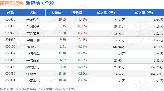 证券之星消息,1月13日商用车板块较上一交易日下跌1.13%,江淮汽车领跌。当日上证指数报收于 4138.76,下跌0.64%。深证成指报收于14169.4,下跌1.37%。商用车板块个股涨跌见下表: | 代码 | 名称 | 主力净流入 (元) | 主力净占比 游资净流入 (元) | | 游资净占比 散户净流入 (元) | | 散户净占比 | | --- | --- | --- | --- | --- | --- | --- | --- | | 600686 | 金龙汽车 | 8008.44万 | 16.09% | 146.89万 | 0.30% | -8155.34万 | -16.39% | | 600066 | 字通客车 | 7688.76万 | 12.37% | -1075.62万 | -1.73% | -6613.14万 | -10.64% | | 600006 | 东风股份 | 4542.99万 | 10.42% | -400.01万 | -0.92% | -4142.98万 | -9.50% | | 600166 | 福田汽车 | 1364.82万 | 3.33% | 97.37万 | 0.24% ...