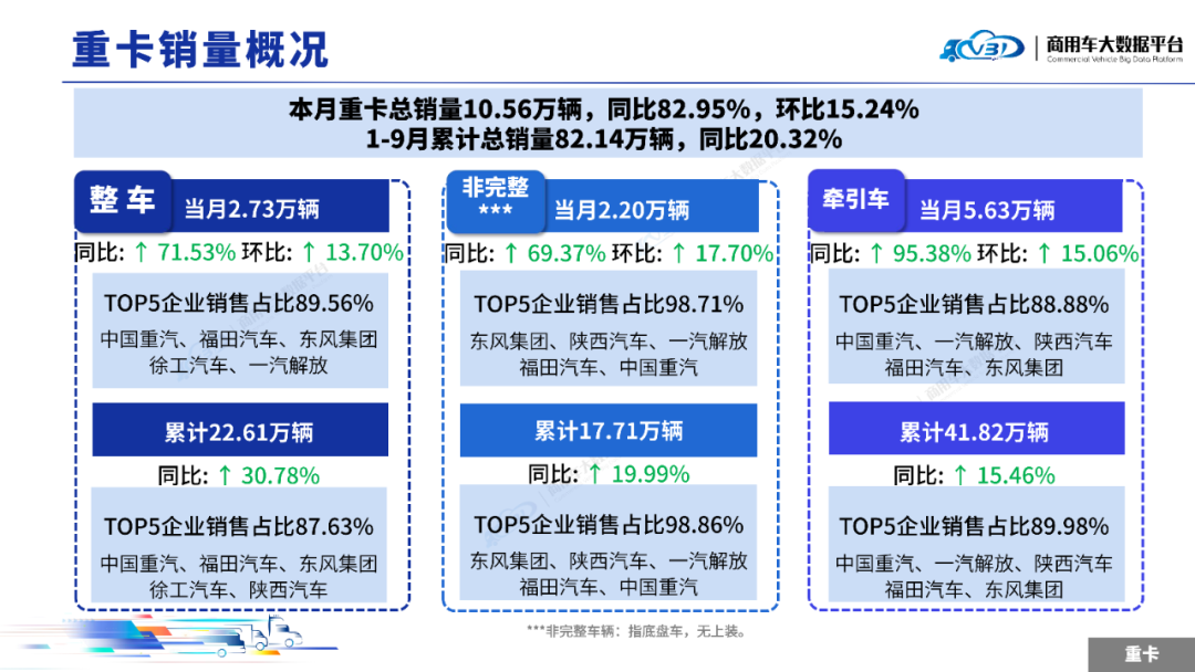 智通财经APP获悉,10月23日,中国汽车流通协会发布《2025年9月中重型卡车销量(批发)月度形势分析报告》。报告指出,9月全国重型卡车销量(批发) 为10.56万辆,同比增长82.95%,环比增长15.24%;中型卡车销量(批发)为1.11万辆,同比增长33.77%,环比增长25.51%。 1-9月,重型卡车累计销量(批发)为82.14万辆,同比增长20.32%;中型卡车累计销量(批发)为8.81万辆,同比下降10.95%。 整体重卡销量月度分析 2025年9月全国重型卡车销量(批发)为10.56万辆,同比增长82.95%,环比增长15.24%;1-8月累计销量(批发)为82.14万辆,同比增长20.32%。 当月重型卡车销量(批发)TOP5企业占比90.87%,依次为中国重汽、一汽解放、陕西汽车、东风集团、福田汽车。 1-9月重型卡车累计销量(批发)TOP5企业占比90.87%,依次为中国重汽、一汽解放、陕西汽车、东风集团、福田汽车。 重卡-牵引车销量月度分析 2025年9月全国牵引车销量(批发)为5.63万辆,同比增长95.38%,环比增长15.06%;1-9月累计销量(批发)为41.82万辆,同比增 ...