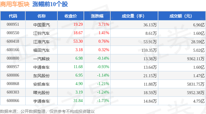 证券之星消息,1月27日商用车板块较上一交易日上涨2.28%,中国重汽领涨。当日上证指数报收于 4139.9,上涨0.18%。深证成指报收于14329.91,上涨0.09%。商用车板块个股涨跌见下表: | 代码 | 名称 | 收盘价 | 涨跌幅 | 成交量(手) | 成交额(元) | | | --- | --- | --- | --- | --- | --- | --- | | 000951 | 中国直汽 | 18.60 | 5.50% | 38.03万 | | 6.93亿 | | 600418 | 江淮汽车 | 52.90 | 4.55% | 70.33万 | | 36.82亿 | | 600066 | 宇通客车 | 32.40 | 3.65% | 29.21万 | | 9.44(乙 | | 000957 | 中通客车 | 11.79 | 1.29% | 18.59万 | | 2.17亿 | | 000550 | 江铃汽车 | 18.41 | 0.00% | 7.36万 | | 1.35亿 | | 000800 | 一汽解放 | 6.99 | -0.14% | 16.14万 | | 1.13亿 | | 60 ...