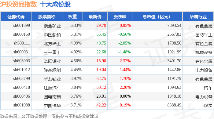 沪投资品(000102)指数十大成份股详情如下: 证券之星消息,10月23日,沪投资品(000102)指数报收于7184.98点,涨0.5%,成交649.17亿元,换手 率1.29%。当日该指数成份股中,上涨的有32家,德业股份以4.61%的涨幅领涨,下跌的有15家,恒立液 压以2.9%的跌幅领跌。 | 证券代码 | 股票简称 | 权重 | 最新价 | 涨跌幅 | 总市值(亿元) | 所属行业 | | --- | --- | --- | --- | --- | --- | --- | | sh601899 | 紫金矿业 | 6.33% | 29.70 | 0.85% | 7893.54 | 有色金属 | | sh600150 | 中国船舶 | 5.31% | 35.45 | -0.56% | 2667.83 | 国防军工 | | sh600111 | 北方稀土 | 4.99% | 49.75 | -2.05% | 1798.50 | 有色金属 | | sh600031 | 三一重工 | 4.92% | 22.68 | -1.48% | 1921.99 | 机械设备 | | sh603993 | 洛阳辑业 | ...