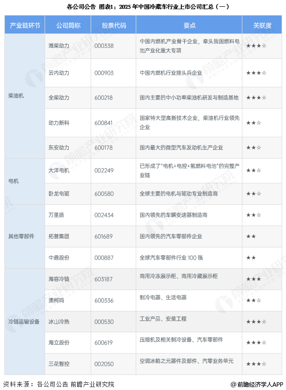 转自:前瞻产业研究院 以下数据及分析来自于前瞻产业研究院冷藏车研究小组发布的《中国冷藏车行业市场需求前景与投资规 划分析报告》 行业主要上市公司:中集车辆(301039)、中国重汽(000951)、福田汽车(600166)、东风汽车(600006)、江 淮汽车(600418)、江铃汽车(000550)、一汽解放(000800)、动力新科(600841)等 本文核心数据:冷藏车业务收入 1、冷藏车行业上市公司汇总 目前,我国以冷藏车相关行业为主营业务企业较少,但冷藏车产业链上下游均较为庞大。其中中游冷藏 车制造环节主要有中集车辆、福田汽车、东风汽车、一汽解放、中国重汽等上市企业。 各公司公告 图表1:2025年中国冷藏车行业上市公司汇总(一) | 产业链环节 | 公司简称 | 股票代码 | 要点 | 关联度 | | --- | --- | --- | --- | --- | | 柴油机 | 潍柴动力 > 云内动力 | 000338 000903 | 中国内燃机产业骨干企业,牵头我国燃料电 池产业化重大专项 中国内燃机行业排头兵企业 | ★★★☆ ★★★☆ | | | 全柴动力 | 600218 | 国内主要的中 ...