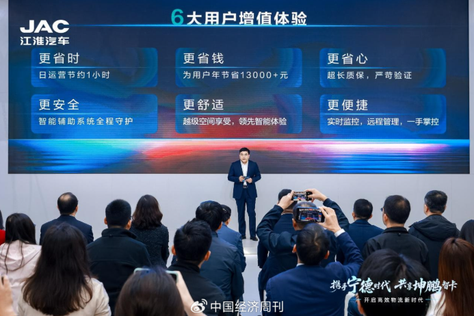 Core Viewpoint - The launch of the Jianghuai 1 Card's new model, Kunpeng ET9, marks a significant step towards a green, efficient, and intelligent logistics era in China's commercial vehicle industry [1] Group 1: Product Features and Innovations - Kunpeng ET9 incorporates five core technological innovations in design, battery, motor, control, and thermal management, addressing key pain points for users of new energy light trucks [2][4] - The vehicle features a unique electric architecture and a wedge-shaped body design, along with a custom battery from CATL, a high-efficiency motor, an integrated controller, and an intelligent temperature control system [2][4] - Compared to other new energy light trucks with the same battery capacity, Kunpeng ET9 offers an increased range of over 100 kilometers [2] Group 2: User Experience and Benefits - Kunpeng ET9 provides six major value experiences: time-saving with a range increase of over 100 kilometers, cost-saving with a potential electricity cost reduction of 30,000 to 40,000 yuan over three years, and peace of mind with extensive warranties [4][5] - The vehicle is equipped with advanced safety features, including an AEB emergency braking system and a lane departure warning system, ensuring comprehensive safety for users [5] - The spacious cabin design offers a comfortable driving experience, with the widest interior space in the industry [5] Group 3: Lifecycle Solutions and Digital Integration - Jianghuai 1 Card has introduced a full lifecycle solution for commercial vehicle users, transforming operational pain points into value opportunities through AI and digitalization [6] - The solution encompasses four key phases: vehicle selection, efficient usage, value-added operations, and vehicle exit, addressing various challenges faced by users [6] - The company emphasizes the importance of technology partnerships and ecosystem collaboration to enhance service coverage and support users throughout their vehicle ownership journey [9]