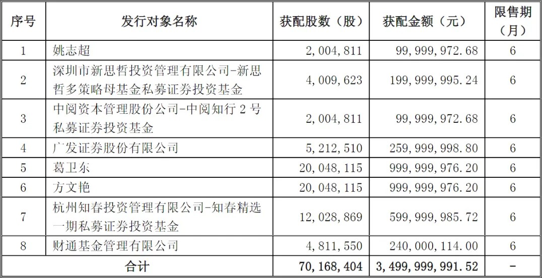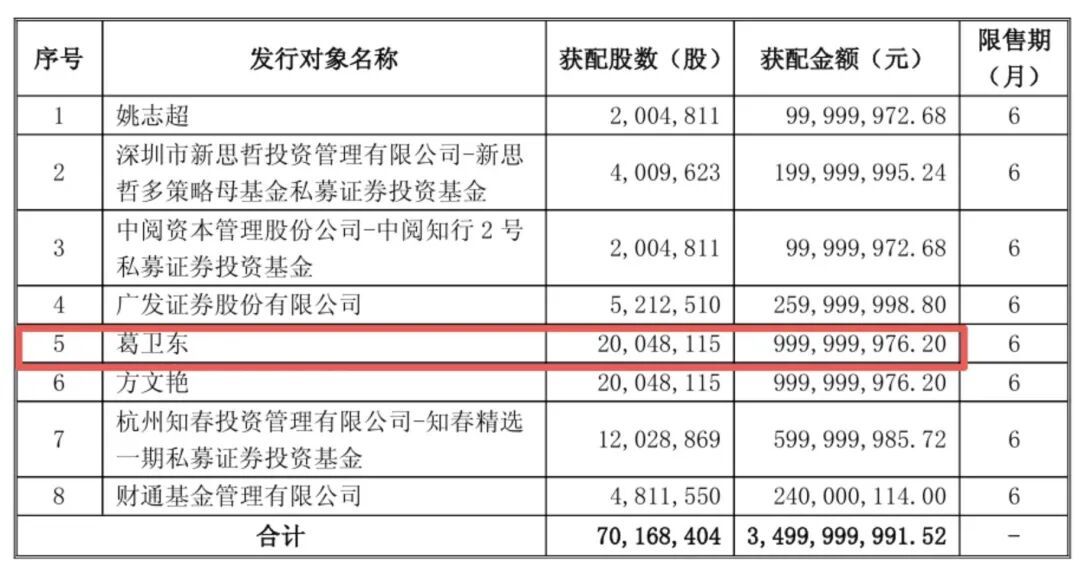2月10日晚,江淮汽车(600418.SH)披露定增发行情况报告书,公司向姚志超、葛卫东等8名投资者合计发行了7016.84万股股份,发行价格为49.88元/ 股,募集资金总额为约35亿元。 其中,私募大佬葛卫东耗资约10亿元认购了2004.81万股。本次向特定对象发行股票完成后,发行对象所认购的股份自发行结束之日起六个月内不得转 让。 同时,超级牛散章建平的妻子方文艳也出资10亿元认购了2004.81万股股份。2025年,章建平因投资寒武纪名声大噪。 发行完成后,葛卫东、方文艳将并列为江淮汽车第8大股东。 | 序号 | 发行对象名称 | 获配股数(股) | 获配金额(元) | 限售期 (月) | | --- | --- | --- | --- | --- | | 1 | 姚志超 | 2,004,811 | 99, 999, 972. 68 | 6 | | 2 | 深圳市新思哲投资管理有限公司-新思 | 4, 009, 623 | 199, 999, 995. 24 | 6 | | | 哲多策略母基金私募证券投资基金 | | | | | 3 | 中阅资本管理股份公司-中阅知行2号 | 2, 004, 811 ...