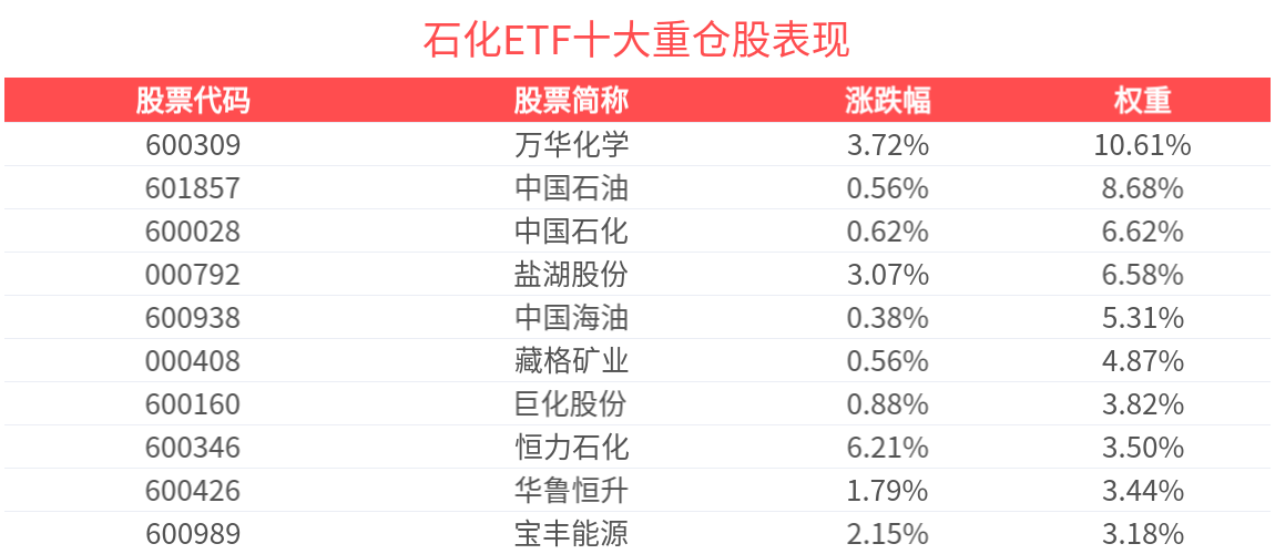 | 股票代码 | 股票简称 | 涨跌幅 | 权重 | | --- | --- | --- | --- | | 600309 | 万华化学 | 3.72% | 10.61% | | 601857 | 中国石油 | 0.56% | 8.68% | | 600028 | 中国石化 | 0.62% | 6.62% | | 000792 | 盐湖股份 | 3.07% | 6.58% | | 600938 | 思想题旺 | 0.38% | 5.31% | | 000408 | 藏格矿业 | 0.56% | 4.87% | | 600160 | 巨化股份 | 0.88% | 3.82% | | 600346 | 恒力石化 | 6.21% | 3.50% | | 600426 | 华鲁恒升 | 1.79% | 3.44% | | 600989 | 宝丰能源 | 2.15% | 3.18% | (以上所列股票仅为指数成份股,无特定推荐之意) 石化ETF(159731),场外联接(华夏中证石化产业ETF发起式联接A:017855;华夏中证石化产业ETF发起式联接C:017856)。 截至2026年2月11日 ,黄金、有色金属、石 ...