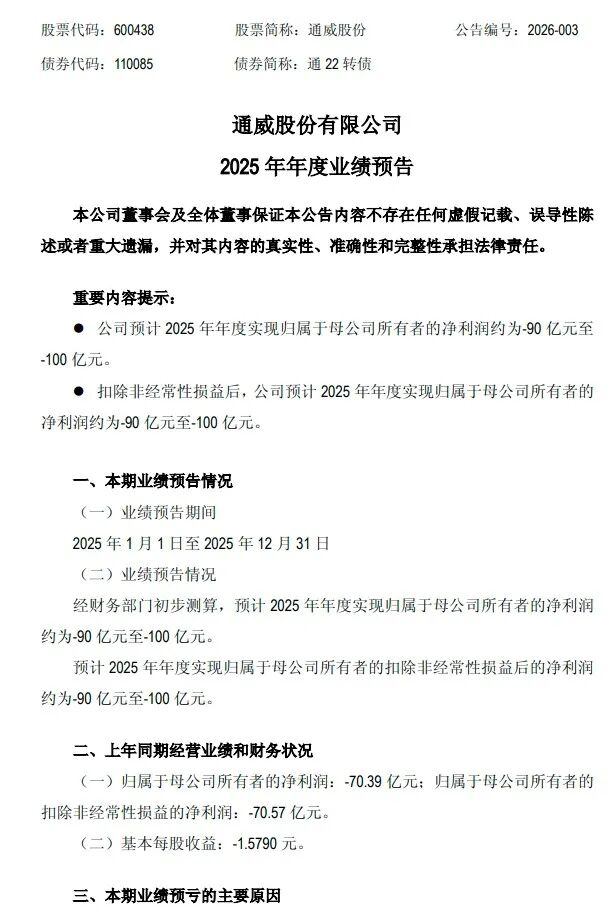 通威股份有限公司 2025年年度业绩预告 本公司董事会及全体董事保证本公告内容不存在任何虚假记载、误导性陈述或者重大遗漏,并对其内容 的真实性、准确性和完整性承担法律责任。 重要内容提示: ● 公司预计2025年年度实现归属于母公司所有者的净利润约为-90亿元至-100亿元。 ● 扣除非经常性损益后,公司预计2025年年度实现归属于母公司所有者的净利润约为-90亿元至-100亿 元。 一、本期业绩预告情况 股票代码:600438 股票简称:通威股份 公告编号:2026-003 债券代码:110085 债券简称:通22转债 (二)基本每股收益:-1.5790元。 三、本期业绩预亏的主要原因 报告期内,光伏新增装机规模总体维持同比增长,但下半年明显放缓,行业阶段性供应过剩问题尚未缓 解,产业链各环节开工率下行,白银等部分核心原材料价格持续上涨,产品价格同比继续下跌,行业经 营压力仍然显著。 (一)业绩预告期间 2025年1月1日至2025年12月31日 (二)业绩预告情况 经财务部门初步测算,预计2025年年度实现归属于母公司所有者的净利润约为-90亿元至-100亿元。 预计2025年年度实现归属于母公司所有者的 ...