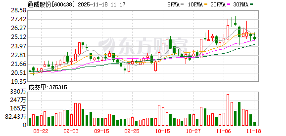 资料显示,通威股份有限公司位于中国(四川)自由贸易试验区成都市高新区天府大道中段588号,成立 日期1995年12月8日,上市日期2004年3月2日,公司主营业务涉及水产饲料、畜禽饲料等产品的研究、 生产和销售;高纯晶硅、太阳能电池等产品的研发、生产、销售为主。主营业务收入构成为:光伏相关 产品65.86%,饲料、食品及相关产品32.89%,其他(补充)1.25%。 11月18日,通威股份盘中下跌2.02%,截至14:12,报24.71元/股,成交12.33亿元,换手率1.10%,总市 值1112.44亿元。 资金流向方面,主力资金净流出6188.69万元,特大单买入8347.33万元,占比6.77%,卖出1.50亿元,占 比12.13%;大单买入2.92亿元,占比23.67%,卖出2.88亿元,占比23.32%。 通威股份今年以来股价涨11.76%,近5个交易日跌7.52%,近20日涨7.06%,近60日涨18.86%。 分红方面,通威股份A股上市后累计派现251.92亿元。近三年,累计派现169.23亿元。 机构持仓方面,截止2025年9月30日,通威股份十大流通股东中,香港中央结算有限公司位居第二大流 ...