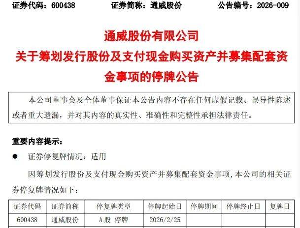 Core Viewpoint - Tongwei Co., Ltd. is planning to acquire 100% equity of Qinghai Lihua Qingneng Co., Ltd. through a combination of share issuance and cash payment, along with raising matching funds [1] Group 1: Transaction Details - The transaction will not lead to a change in the controlling shareholder or actual controller of the company and is not considered a related party transaction [3] - The company's stock and convertible bonds will be suspended from trading starting February 25, 2026, for a period not exceeding 10 trading days due to the ongoing planning stage of the transaction [3] Group 2: Target Company Overview - Lihua Qingneng, established in April 2021, focuses on the manufacturing, sales, and R&D of electronic materials and semiconductor devices, as well as photovoltaic equipment [5] - The company is a key investment project in Qinghai Province, with a planned total investment of 20 billion yuan and an expected annual output value of approximately 20 billion yuan [6] - Lihua Qingneng has been recognized as one of the "Top 50 Qinghai Enterprises" in the 2025 "China's Top 500 Enterprises" list, with a reported sales revenue of 3.954 billion yuan [6]