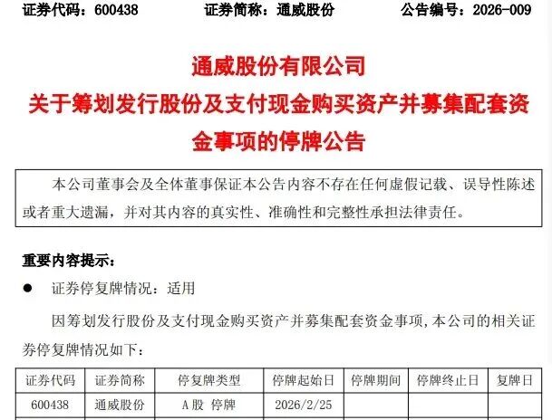 2月24日晚间,硅料龙头公司通威股份公告称,公司正在筹划通过发行股份及支付现金的方式,购买青 海丽豪清能股份有限公司(丽豪清能)100%股权,并募集配套资金。公司股票、可转债以及可转债转 股自2月25日开市起停牌,预计停牌时间不超过10个交易日。 本次交易不会导致通威股份控股股东、实际控制人发生变更,不构成关联交易,预计不构成重大资产重 组。 | 证券代码 | 证券简称 | 停复牌类型 | 停牌起始日 | 停牌期间 | 停牌终止日 | 复牌日 | | --- | --- | --- | --- | --- | --- | --- | | 600438 | 通威股份 | A 股 停牌 | 2026/2/25 | | | | | 110085 | 通 22 转债 | 可转债债券停牌 | 2026/2/25 | | | | | 110085 | 通 22 转债 | 可转债转股停牌 | 2026/2/25 | | | | 图片来源:公司公告 Wind数据显示,2月24日,通威股份收报18.16元/股,最新市值为818亿元。 公告显示,本次拟收购标的为丽豪清能的全部股权,该公司成立于2021年4月29日,法定代表人为崔 ...