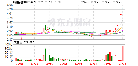 证券代码:600477 证券简称:杭萧钢构 公告编号:2026-004 杭萧钢构股份有限公司 股票交易异常波动暨风险提示公告 本公司董事会及全体董事保证本公告内容不存在任何虚假记载、误导性陈 述或者重大遗漏,并对其内容的真实性、准确性和完整性承担法律责任。 重要内容提示: 杭萧钢构股份有限公司(以下简称"公司")股票自 2026 年 1 月 8 日起 至 2026 年 1 月 13 日连续 4 个交易日涨停,累计涨幅偏离值达到 46.80%,显著 偏离大盘指数。2026 年 1 月 13 日,公司股票换手率较高,达 15.79%,明显放量, 交易风险较大。公司股价短期波动幅度较大,已明显偏离市场走势,存在较高的 炒作风险,目前公司股价已严重偏离上市公司基本面,未来存在快速下跌的风险。 经公司自查,并书面问询公司控股股东及实际控制人,截至本公告披露 日,公司、控股股东及实际控制人不存在应披露而未披露的重大信息。 公司主营业务为钢结构专业总承包及 EPC 总承包,专业设计、制造、施 工(安装)各类轻型钢结构、桥梁钢结构、大跨度空间钢结构、多高层钢结构、 超高层钢结构、钢结构住宅等。近期,公司作为联合体成员与湖南建 ...