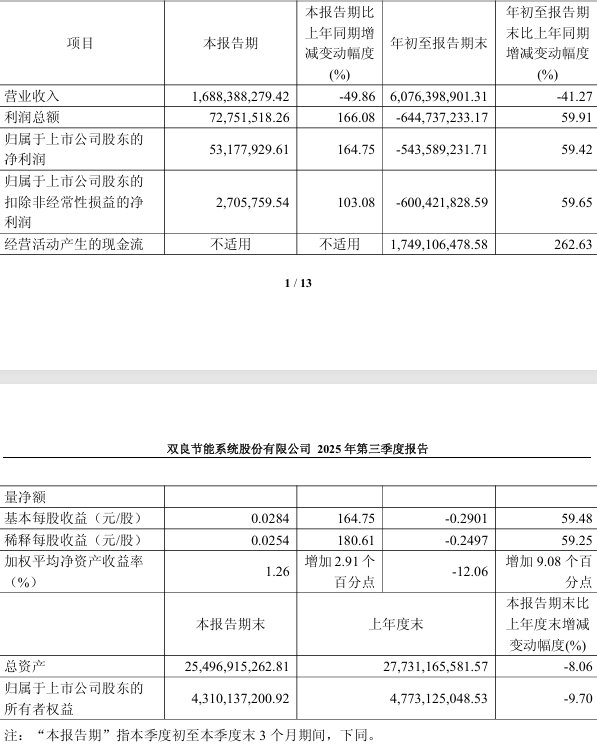 智通财经APP讯,双良节能(600481.SH)披露2025年第三季度报告,公司前三季度实现营收60.76亿元, 同比下降41.27%;归属于上市公司股东的净利润亏损5.44亿元;扣非净利润亏损6亿元;基本每股收 益-0.2901元。 ...