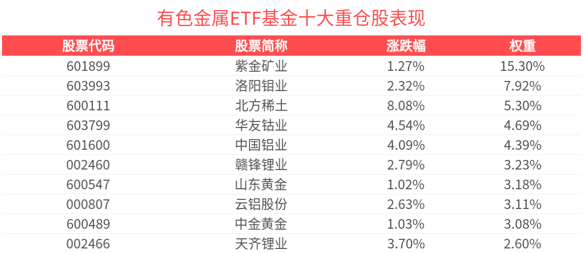 截至2026年2月25日 10:30,中证细分有色金属产业主题指数(000811)强势上涨3.39%,成分股云南锗业上涨10.01%,锡业股份上涨9.73%,驰宏锌锗上涨 8.49%,北方稀土,安宁股份等个股跟涨。有色金属ETF基金(516650)上涨3.30%,截至2026年2月24日,有色金属ETF基金今年以来累计上涨20.76%。 | 股票代码 | 股票简称 | 涨跌幅 | 权重 | | --- | --- | --- | --- | | 201899 | 紫金矿业 | 1.27% | 15.30% | | 603993 | 洛阳辑业 | 2.32% | 7.92% | | 600111 | 北方稀土 | 8.08% | 5.30% | | 603799 | 华友钻业 | 4.54% | 4.69% | | 601600 | 中国铝业 | 4.09% | 4.39% | | 002460 | 赣锋锂业 | 2.79% | 3.23% | | 600547 | 山东黄金 | 1.02% | 3.18% | | 000807 | 云铝股份 | 2.63% | 3.11% | | 600489 | 中令黄金 ...