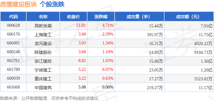 | 代码 | 名称 | 收盘价 | 涨跌幅 | 成交量(手) | 成交额(元) | | --- | --- | --- | --- | --- | --- | | 000628 | 高新发展 | 52.52 | 3.65% | 14.97万 | 7.77亿 | | 600491 | 龙元建设 | 66'7 | 0.34% | 22.26万 | 6676.18万 | | 66009 | 重庆建工 | 3.19 | -0.62% | 13.99万 | 4429.86万 | | 601668 | 中国建筑 | 5.02 | -1.38% | 302.03万 | 15.26亿 | | 600248 | 陕建股份 | 3.58 | -1.38% | 29.36万 | 1.05亿 | | 601789 | 宁波建工 | 5.21 | -1.51% | 30.87万 | 1.61亿 | | 002761 | 浙江建投 | 8.57 | -2.83% | 21.02万 | 1.80亿 | | 600170 | ┣海建工 | 2.89 | -3.02% | 377.83万 | 10.83亿 | 证券之星消息,1月27日房屋建设 ...