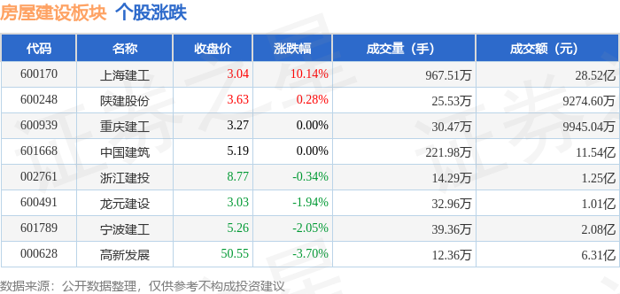 证券之星消息,1月13日房屋建设板块较上一交易日上涨0.66%,上海建工领涨。当日上证指数报收于 4138.76,下跌0.64%。深证成指报收于14169.4,下跌1.37%。房屋建设板块个股涨跌见下表: | 代码 | 名称 | 主力净流入 (元) | 主力净占比 游资净流入 (元) | | 游资净占比 散户净流入 (元) | | 散户净占比 | | --- | --- | --- | --- | --- | --- | --- | --- | | 600170 上海建工 | | 6.03亿 . | 21.14% | -2.35 Z | -8.25% | -3.68 Z | -12.90% | | 601668 中国建筑 | | 3481.18万 | 3.02% | -2561.25万 | -2.22% | -919.93万 | -0.80% | | 002761 浙江建投 | | 538.92万 | 4.29% | -82.76万 | -0.66% | -456.16万 | -3.64% | | 600248 陕建股份 | | 3.40万 | 0.04% | 299.95万 | 3.23% | -303.3 ...
