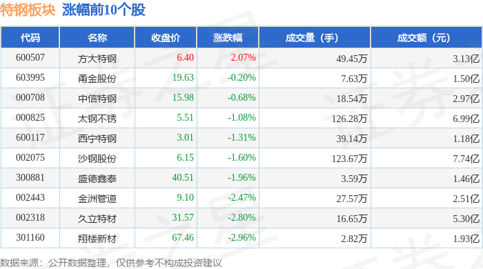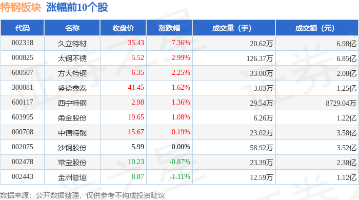 | 代码 | 名称 | 收盘价 | 涨跌幅 | 成交量(手) | 成交额(元) | | | --- | --- | --- | --- | --- | --- | --- | | 002318 | 久立特材 | 35.43 | 7.36% | 20.62万 | | 6.98 亿 | | 000825 | 太钢不锈 | 5.52 | 2.99% | 126.37万 | | 6.85 Z | | 600507 | 方大特钢 | 6.35 | 2.25% | 33.00万 | | 2.08亿 | | 300881 | 感德整表 | 41.45 | 1.62% | - 3.03万 | | 1.25亿 | | 600117 | 西宁特钢 | 2.98 | 1.36% | 29.54万 | | 8729.04万 | | 603995 | 角金股份 | 19.65 | 1.08% | 6.26万 | | 1.22亿 | | 000708 | 中信特钢 | 15.67 | 0.19% | 23.02万 | | 3.58亿 | | 002075 | 沙钢股份 | 5.99 | 0.00% | 58.92万 | | 3.52亿 ...