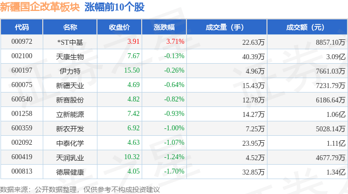 | 代码 | 名称 | 收盘价 | 涨跌幅 | 成交量(手) | 成交额(元) | | --- | --- | --- | --- | --- | --- | | 000972 | *ST中基 | 3.91 | 3.71% | 22.63万 | 8857.10万 | | 002100 | 天康生物 | 7.67 | -0.13% | 40.39万 | - 3.09 Z | | 600197 | 伊力特 | 15.50 | -0.26% | 4.96万 | 7661.03万 | | 600075 | 新疆天业 | 4.69 | -0.64% | 15.43万 | 7231.79万 | | 600540 | 新賽股份 | 4.82 | -0.82% | 12.78万 | 6186.64万 | | 001258 | 立新能源 | 7.42 | -0.93% | 14.27万 | 1.06亿 | | 600359 | 新农开发 | 6.92 | -1.00% | 7.25万 | 5028.14万 | | 002092 | 中泰化学 | 4.63 | -1.07% | 23.95万 | 1.11亿 | | 600419 ...