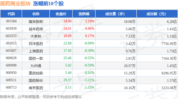 Market Overview - The pharmaceutical commercial sector declined by 1.33% on November 19, with Renmin Tongtai leading the losses [1] - The Shanghai Composite Index closed at 3946.74, up 0.18%, while the Shenzhen Component Index closed at 13080.09, unchanged [1] Stock Performance - Key stocks in the pharmaceutical commercial sector showed varied performance, with Jianfa Zhixin rising by 3.19% to a closing price of 34.00, while Renmin Tongtai fell by 9.99% to 15.95 [2][1] - The trading volume for Jianfa Zhixin was 180,800 shares, with a transaction value of 620 million yuan [1] - Other notable stocks included Yifeng Pharmacy, which increased by 0.46%, and Shanghai Pharmaceuticals, which decreased by 0.39% [1] Capital Flow - The pharmaceutical commercial sector experienced a net outflow of 436 million yuan from institutional investors, while retail investors saw a net inflow of 408 million yuan [2] - The data indicates that retail investors are more active in the sector despite the overall decline in stock prices [2] Individual Stock Capital Flow - Jianfa Zhixin had a net inflow of 70.39 million yuan from institutional investors, while Renmin Tongtai saw a significant outflow of 1.20 billion yuan from retail investors [3] - Other stocks like Guoyao Yizhi and Zhongyao Holdings also experienced mixed capital flows, with Guoyao Yizhi having a net inflow of 7.36 million yuan from institutional investors [3]