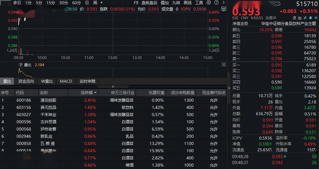 ETF盘中资讯|茅台又“秒空”!“茅五泸汾洋”齐涨,食品饮料ETF华宝(515710)红盘震荡!机构:白酒板块或迎底部配置机会