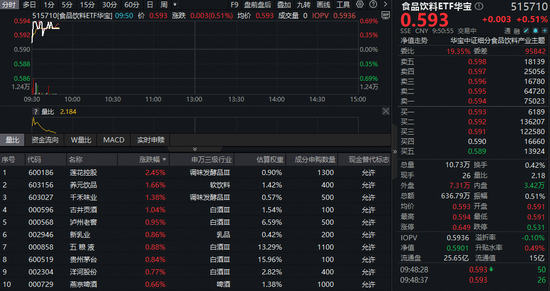 吃喝板块今日(1月9日)开盘后震荡上行,截至发稿,反映吃喝板块整体走势的食品饮料ETF华宝 (515710)场内价格涨0.51%。 成份股方面,白酒、大众品均表现亮眼。截至发稿,莲花控股涨超2%,古井贡酒、养元饮品等涨超 1%,贵州茅台、五粮液、泸州老窖、洋河股份、山西汾酒等亦小幅飘红。 | | | 分时 多日 1分 5分 15分 30分 60分 日 周 * | | | | | | F9 盘前盘后 盛加 九转 画线 工具 @ 2 > | | | 食品饮料ETF华宝 ① | 515710 | | --- | --- | --- | --- | --- | --- | --- | --- | --- | --- | --- | --- | --- | | 0.504 | | | | | 515710(食品饮料ETFIFIS) 09:50 价 0.593 源跌 0.003(0.51%) 均价 0.593 服交量 0 10PV 0.5936 | | | | 0.6996 | OFFBB | | +0.003 +0.51% | | 0.592 ht | | | | | | | | | 0.35% | SSE CNY 9 ...