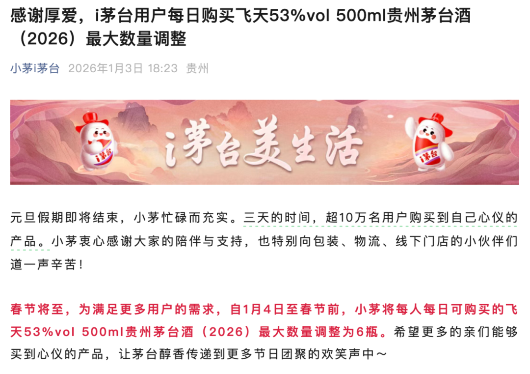 近期,贵州茅台动作不断。 贵州茅台成立爱茅台数字科技公司 经营范围含集成电路芯片及产品销售等 一方面,贵州茅台数字化转型再落关键一子。天眼查数据显示, 近日,贵州爱茅台数字科技有限公司成立, 注册资本6亿元, 经营范围包 含:互联网直播技术服务;区块链技术相关软件和服务;集成电路芯片及产品销售;工业互联网数据服务等。 12月31日 ,i茅台官微宣布,2026年1月1日起53%vol500ml飞天茅台酒正式上架, 用户每日限购12瓶。 1月1日投放开启后,这款售价 1499元的飞天茅台每五分钟上架一次, 每次不到30秒即售罄。 紧随其后,i茅台于 1月3日 晚间调整限购规则,将春节前的单人 每日限购量降至6瓶。 即便如此,1月4日政策落地当天,i茅台APP仍持续显 示"补货中"。据官方披露,元旦三天超10万名用户成功购得茅台产品。 此外, 茅台经销商也同步跟进促销。 成都川糖供应链管理有限公司1月4日发布通知,推出1499元飞天茅台预订活动, 每位客户最多可订 5件, 进一步放大终端放量效应。 下载财联社APP获取更多资讯 准确 快速 权威 专业 7x24h电报 头条新闻 VIP资讯 实时盯盘 | 工商信息 ● ...