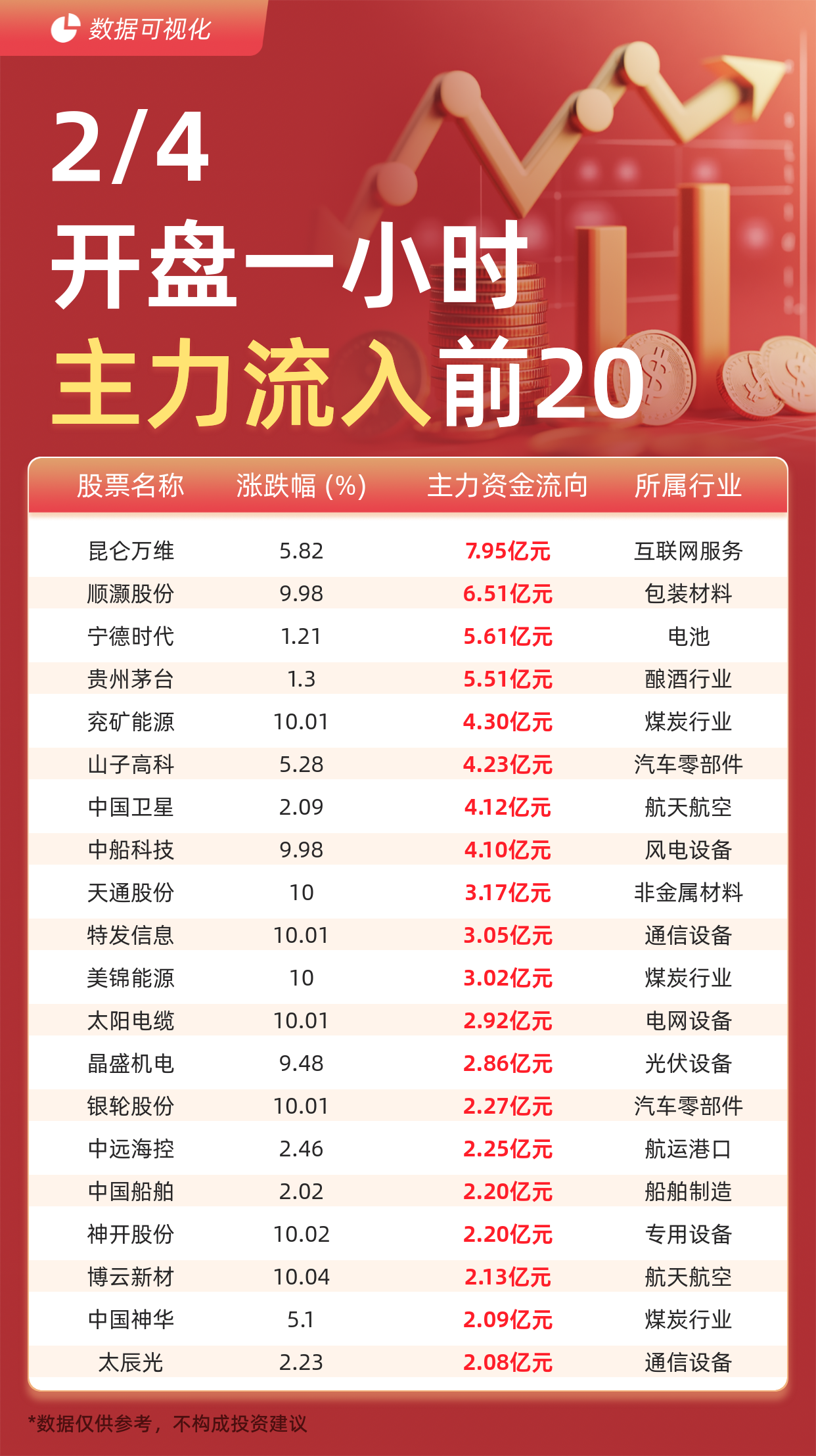 | 太阳电缆 | 10.01 | 2.92亿元 | 电网设备 | | --- | --- | --- | --- | | 晶盛机电 | 9.48 | 2.86亿元 | 光伏设备 | | 银轮股份 | 10.01 | 2.27亿元 | 汽车零部 | | 中远海控 | 2.46 | 2.25亿元 | 航运港[ | | 中国船舶 | 2.02 | 2.20亿元 | 船舶制送 | | 神开股份 | 10.02 | 2.20亿元 | 专用设{ | | 博云新材 | 10.04 | 2.13亿元 | 航天航空 | | 中国神华 | 5.1 | 2.09亿元 | 煤炭行业 | | 太辰光 | 2.23 | 2.08亿元 | 通信设 | *数据仅供参考,不构成投资建议 | 股票名称 | 涨跌幅 (%) | 主力资金流向 | 所属行) | | --- | --- | --- | --- | | 昆仑万维 | 5.82 | 7.95亿元 | 互联网服 | | 顺灏股份 | 9.98 | 6.51亿元 | 包装材料 | | 宁德时代 | 1.21 | 5.61亿元 | 电池 | | 贵州茅台 | 1.3 | 5.51亿元 | 酿酒 ...