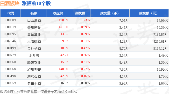 证券之星消息,11月17日白酒板块较上一交易日上涨0.58%,山西汾酒领涨。当日上证指数报收于 3972.03,下跌0.46%。深证成指报收于13202.0,下跌0.11%。白酒板块个股涨跌见下表: 从资金流向上来看,当日白酒板块主力资金净流出1.06亿元,游资资金净流出1.45亿元,散户资金净流入 2.52亿元。白酒板块个股资金流向见下表: | 代码 | 名称 | 收盘价 | 涨跌幅 | 成交量(手) | 成交额(元) | | --- | --- | --- | --- | --- | --- | | 600809 | 山西汾酒 | 198.99 | 1.23% | 7.05万 | 14.03亿 | | 600519 | 贵州茅台 | 1471.00 | 0.99% | 3.45万 | 50.36亿 | | 000995 | 青岛温州 | 13.55 | 0.89% | 5.34万 | 7195.87万 | | 002646 | 天佑德酒 | 9.97 | 0.61% | 4.29万 | 4250.61万 | | 661009 | 第中于酒 | 10.59 | 0.47% | 8.70万 | 9164.12 ...