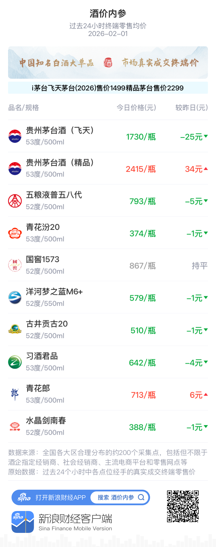 新浪财经"酒价内参"过去24小时收集的数据显示,中国白酒市场十大单品的终端零售均价在2月1日呈现涨 跌互现格局。如果十大单品各取一瓶整体打包售卖,今日总售价为9011元,较昨日小幅上涨2元,整体价 格升至近20天的最高位。今日市场十大单品两涨七跌一平,价格权重差异带动整体均价内部结构出现对冲 变化。上涨产品中,精品茅台环比上涨34元/瓶,为今日涨幅最大单品,涨幅创下"酒价内参"11月10日上线 以来的最高纪录;青花郎同步回升,上涨6元/瓶。下跌产品方面,飞天茅台回落25元/瓶,为当日回调幅度 居前的核心单品,昨日飞天茅台大幅飙升90元/瓶;五粮液普五八代下跌5元/瓶;习酒君品回落4元/瓶。此 外,水晶剑南春、古井贡古20、洋河梦之蓝M6+及青花汾20均小幅下探,跌幅均为1元/瓶。国窖1573的价 格保持稳定,与昨日持平。 | 中国知名白酒大单品 图 | 市场真实成交终端价 | | | --- | --- | --- | | i茅台飞天茅台(2026)售价1499精品茅台售价2299 | | | | 品名/规格 | 今日价格(元) | 较昨日(元) | | 贵州茅台酒(飞天) 53度/500ml | 1730/ ...